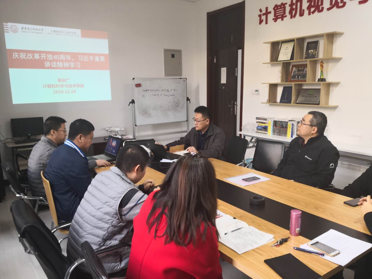 (通讯员 王琨)12月18日上午,庆祝改革开放40周年大会隆重召开。中共中央总书记、国家主席、中央军委主席习近平出席大会并发表重要讲话。当天下午,yl23455永利官网网络工程系党支部在主楼四区225开展了学习“习近平在庆祝改革开放40周年大会上的重要讲话”主题党日活动。本次活动由支部书记苗启广教授主持,支部党员参加学习。
